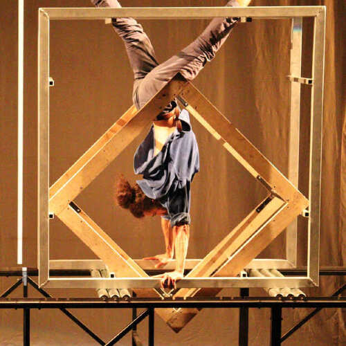 La Technique du poisson doré est un spectacle original et surprenant à la frontière entre concert et cirque. Sur scène, un convoyeur géant traverse tout l’espace. Il transporte des formes géométriques en bois et en métal, comme une étrange partition graphique. Tandis qu’un musicien compose et interprète la musique en direct, un acrobate, tel un ouvrier des Temps Modernes, se déplace sur ces formes mouvantes, en équilibre, parfois emporté, parfois en maîtrise, comme pris dans une chaîne de production musicale.